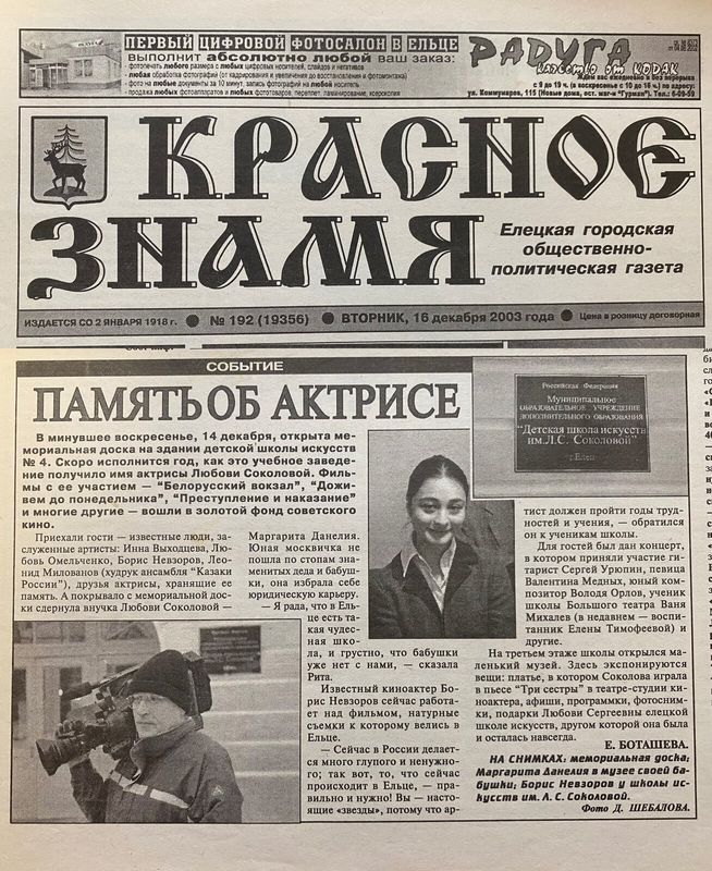 В 2002 году при поддержке Союза кинематографистов РФ и Елецкого землячества Детской школе искусств было присвоено имя нар. артистки СССР Л.С.Соколовой.