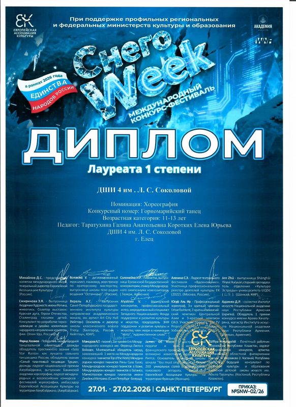 Поздравляем воспитанников хореографического отделения с победой и получением звания лауреата 1 степени в Международном конкурсе-фестивале «СнегоWEEK», который проходил в рамках Года единства народов России.