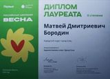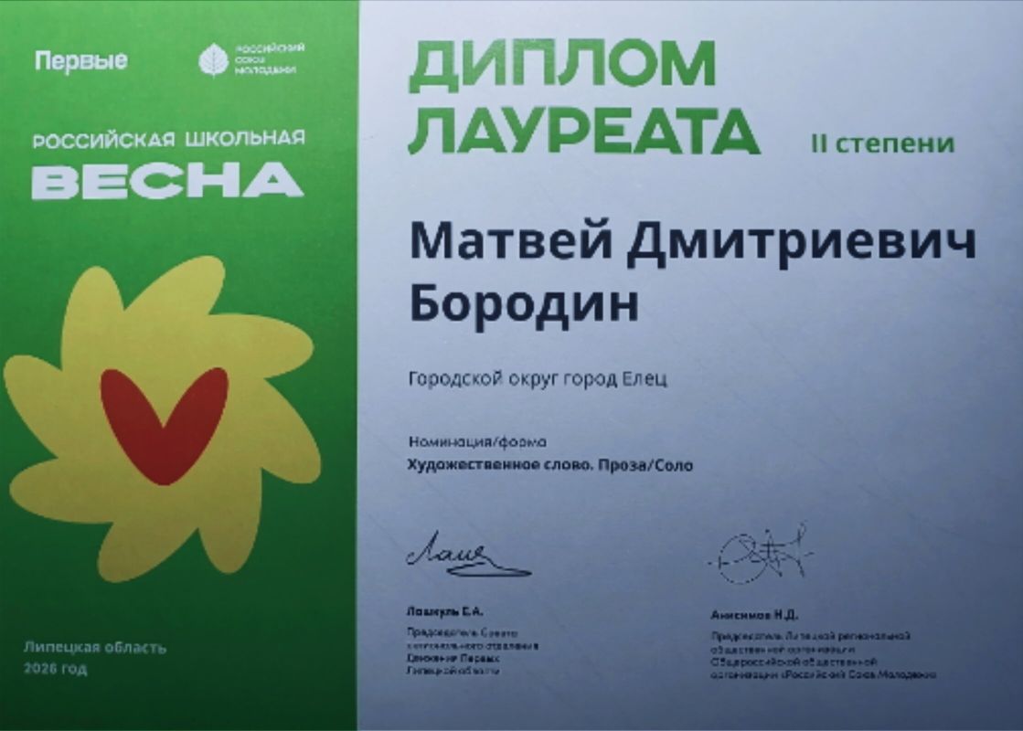 Наш ученик, БОРОДИН МАТВЕЙ, достойно представил город на региональном этапе Всероссийского проекта-фестиваля «Российская школьная весна», получив звание ЛАУРЕАТА 2 СТЕПЕНИ в номинации Художественное слово/соло с произведением И.А.Бунина «Антоновские яблоки». Мероприятие прошло 19 марта в Липецком Доме музыки.